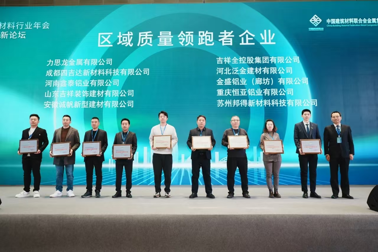 總結(jié)2024年行業(yè)成績,為促進(jìn)行業(yè)高質(zhì)量發(fā)展,金屬分會(huì)對(duì)獲得金屬復(fù)合材料行業(yè)質(zhì)量領(lǐng)跑者與綠色供應(yīng)鏈企業(yè)和金屬復(fù)合材料行業(yè)綠色建材獲證企業(yè)進(jìn)行表彰。并頒發(fā)2024年度鋁塑復(fù)合板、不燃金屬復(fù)合板、鋁單板、蜂窩板及鋁波紋芯復(fù)合鋁板產(chǎn)品合格證書。河北泛金建材有限公司榮獲“鋁單板-區(qū)域質(zhì)量領(lǐng)跑者企業(yè)”及“2023-2024年度氟碳液體噴涂鋁單板產(chǎn)品合格證”。